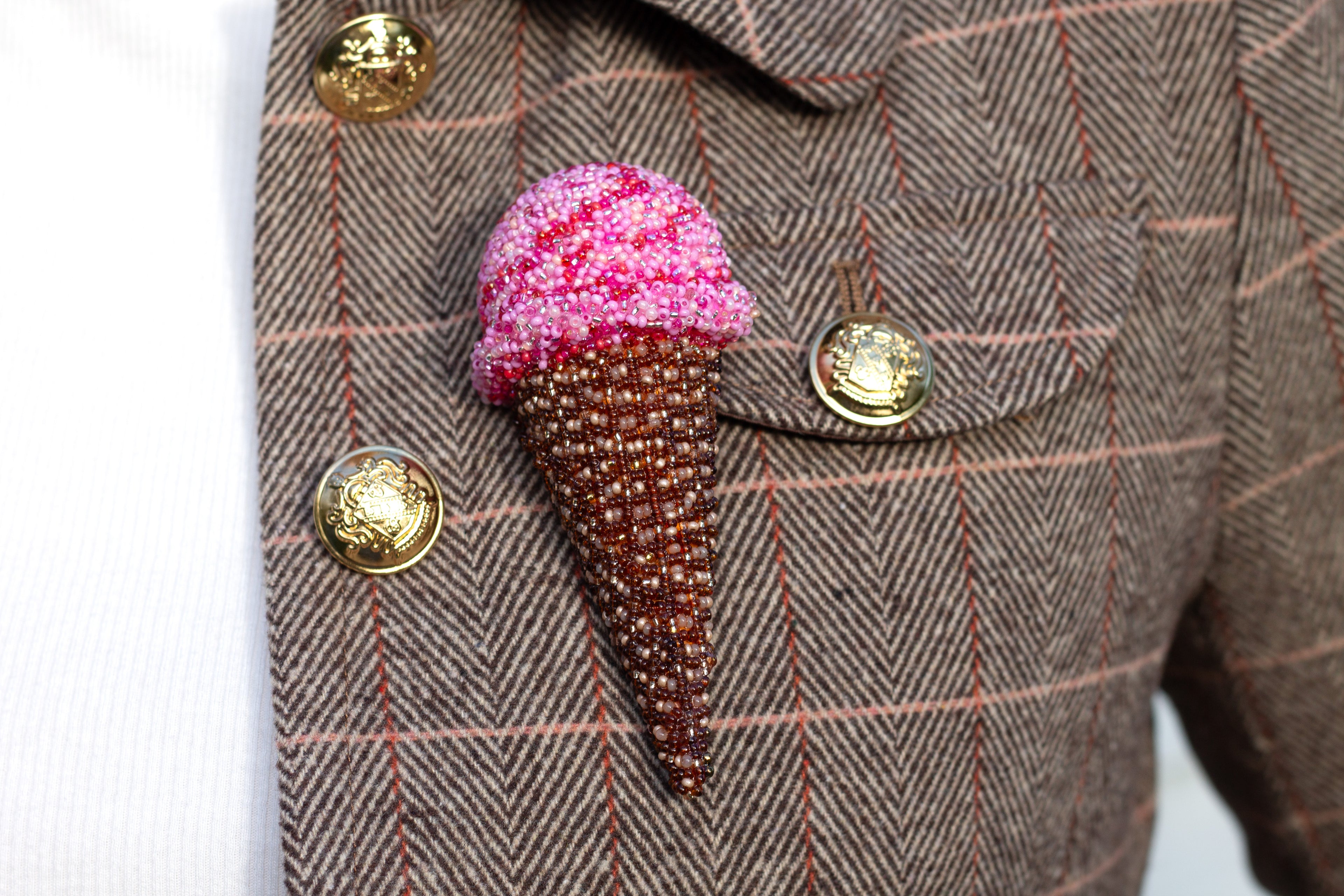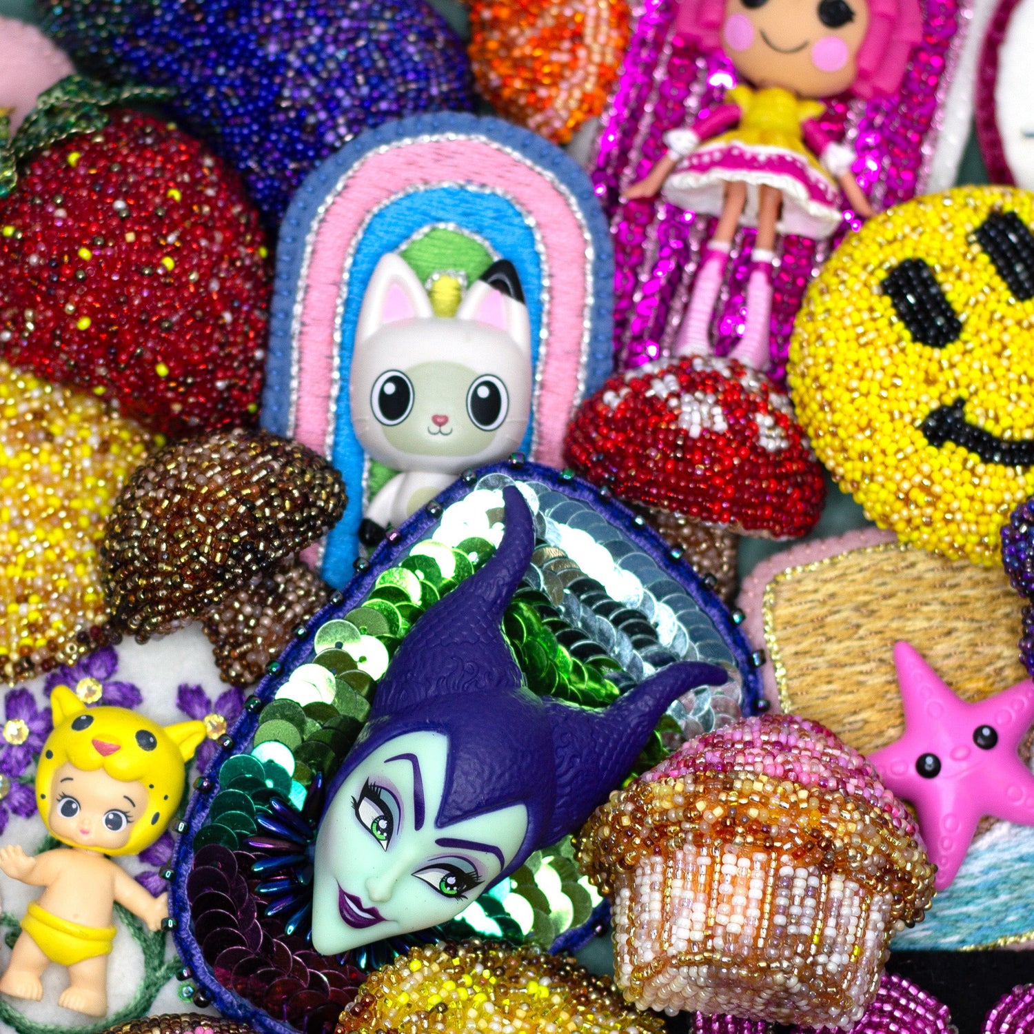 Each brooch is a reimagined toy given new life through beads, embroidery, and just the right amount of audacity.
